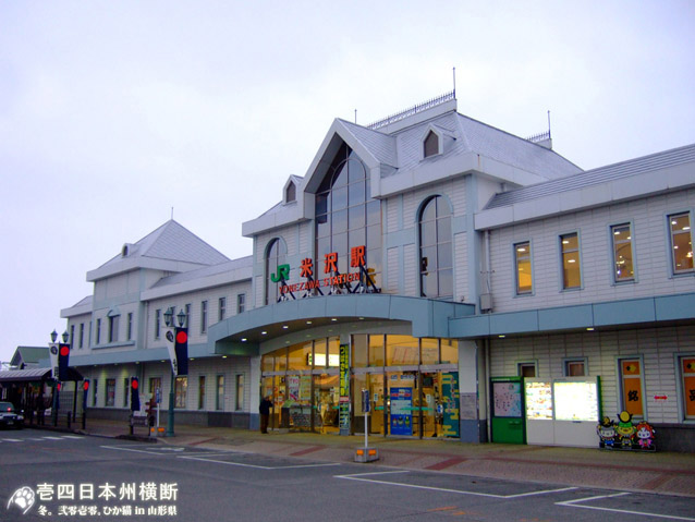 值班的阿伯非常貼心地遞出一張手掌般大小的循環巴士時刻表,告訴我們要在哪一號的站牌等車,還順便把公車回程車站時,可以馬上搭回仙台的新幹線班次也圈起來……東北的大叔阿伯們真是親切! (其實我都有大略查過新幹線時刻,只是沒想到阿伯細心到這個程度,讓我好訝異。)〈天地人〉在2009年一整年播出期間,曾經有幸在米澤站周邊看見天地人相關的海報文宣;現在月台的牆壁上仍舊還是一整排的海報、可愛的周邊商品、車站內的直江兼續像、街道上路燈掛著天地人的廣告旗幟……。總之,視線範圍內都是天地人。